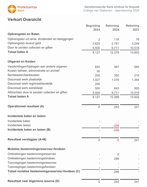 De kerkenraad heeft de algemene eindverantwoordelijkheid voor het in stand houden van een levende gemeente. Dat doet zij door zoveel mogelijk gemeenteleden in te schakelen bij het plaatselijk werk. Enkele taken zijn conform de kerkorde gedelegeerd naar afzonderlijke colleges, waaronder het College van Kerkrentmeesters en het College van Diakenen. Zij waken over de financiële slagkracht van de gemeente en leggen via een jaarverslag rekening en verantwoording af aan de kerkenraad. Een uittreksel van de belangrijkste gegevens treft u hieronder aan.